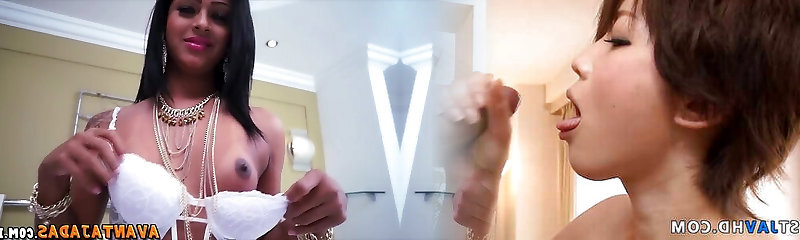 seductora transexual japonesa en solitario en lápiz labial juega con su polla