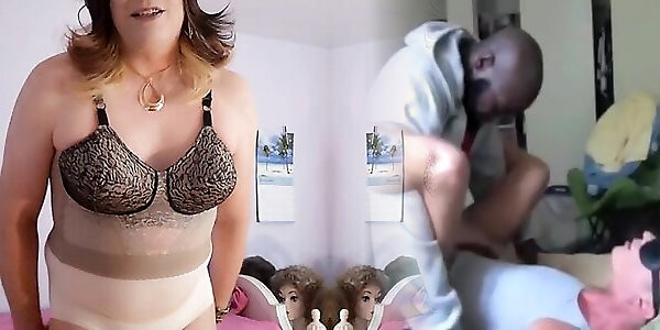 Crossdresser in mummy-in-law lingerie jizzing on her dark-hued
