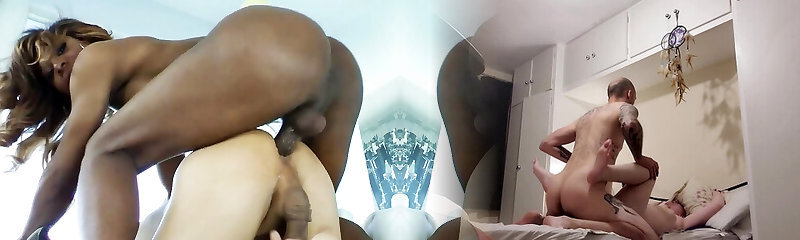 Big cock black tranny top fucks him in his cock-squeezing white ass