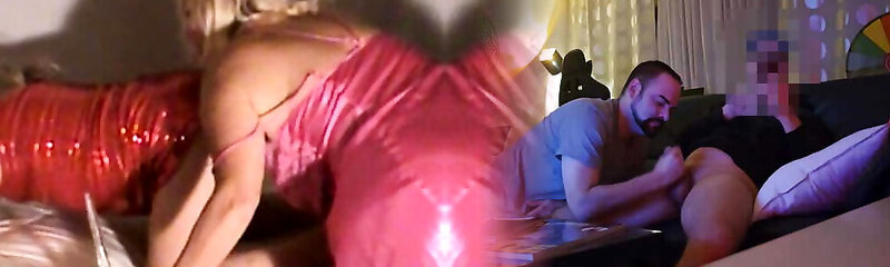 Sandy-haired ladyboy in black skirt rails her lover's cock on the