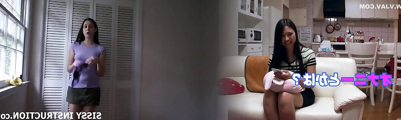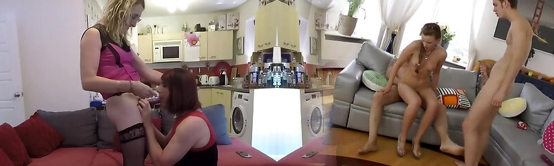 Platinum-blonde on dark haired SheLesbians playing with a camera and their shelesbian cocks while kissing each other and getting rock hard and