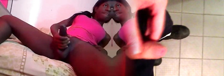 Chocolate t-girl spreads whipcream on her knockers and faps off