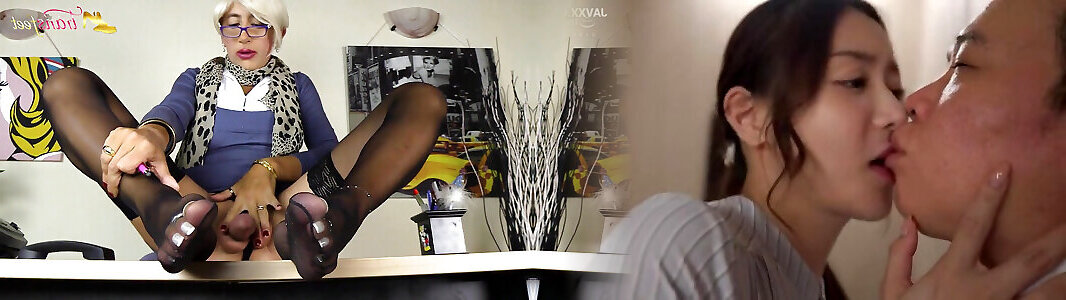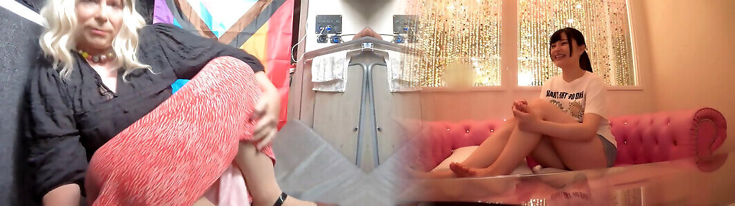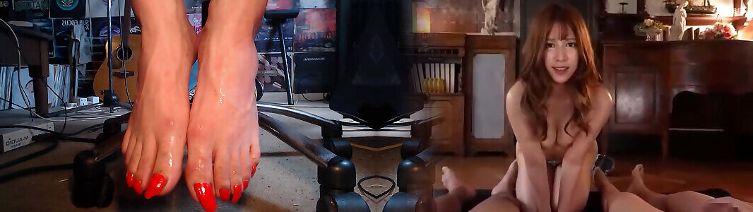 Tranny Irene Aoki pleasing herself, licking feet, footjob on dildo