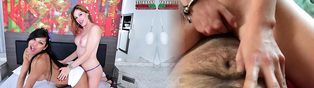 Two tempting T-girls are fucked by one super-hot blooded tattooed stud